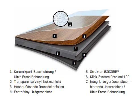 authentischer, sehr stabiler Vinyl-Designboden in Dielenoptik mit ISOCORE Technologie und Droplock 100 Klicksystem