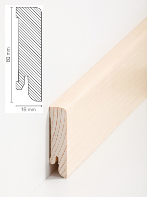Diese hochwertige echtholzfurnierte Holz-Fussleiste hat eine Deckfläche von 16mm Breite, eine Höhe von 60mm und hat eine Länge von 2,50m. Diese Massivholz-Sockelleisten eignen sich für jeden Bodenbelag. Das eröffnet unerschöpfliche Gestaltungsmöglichkeiten und befriedigt jeden noch so ausgefallenen Geschmack. Eine Clipmontage ist möglich.| Eigenschaften | |||